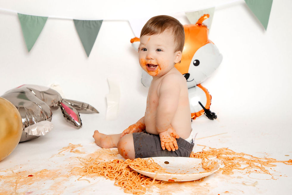 My favourite model has turned 1!! This boy is up for all the photo shoots with that big huge smile and I am grateful for it. For his cake smash, we started with cake. His mom was brilliant and added strawberries to the top because she knew he would for sure go for those if he wasn't interested in the cake (which he wasn't). Then we got a little messy with some yummy spaghetti! This is his favourite food so why not include that for his first birthday pics!